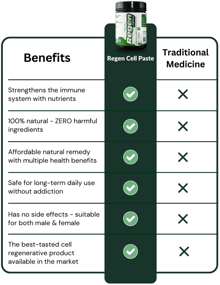 Two spoons of Regen Cell Paste daily gives you ALL the nutrients needed to boost your body’s natural ability to repair and regenerate damaged cells, improve your overall health and vitality.